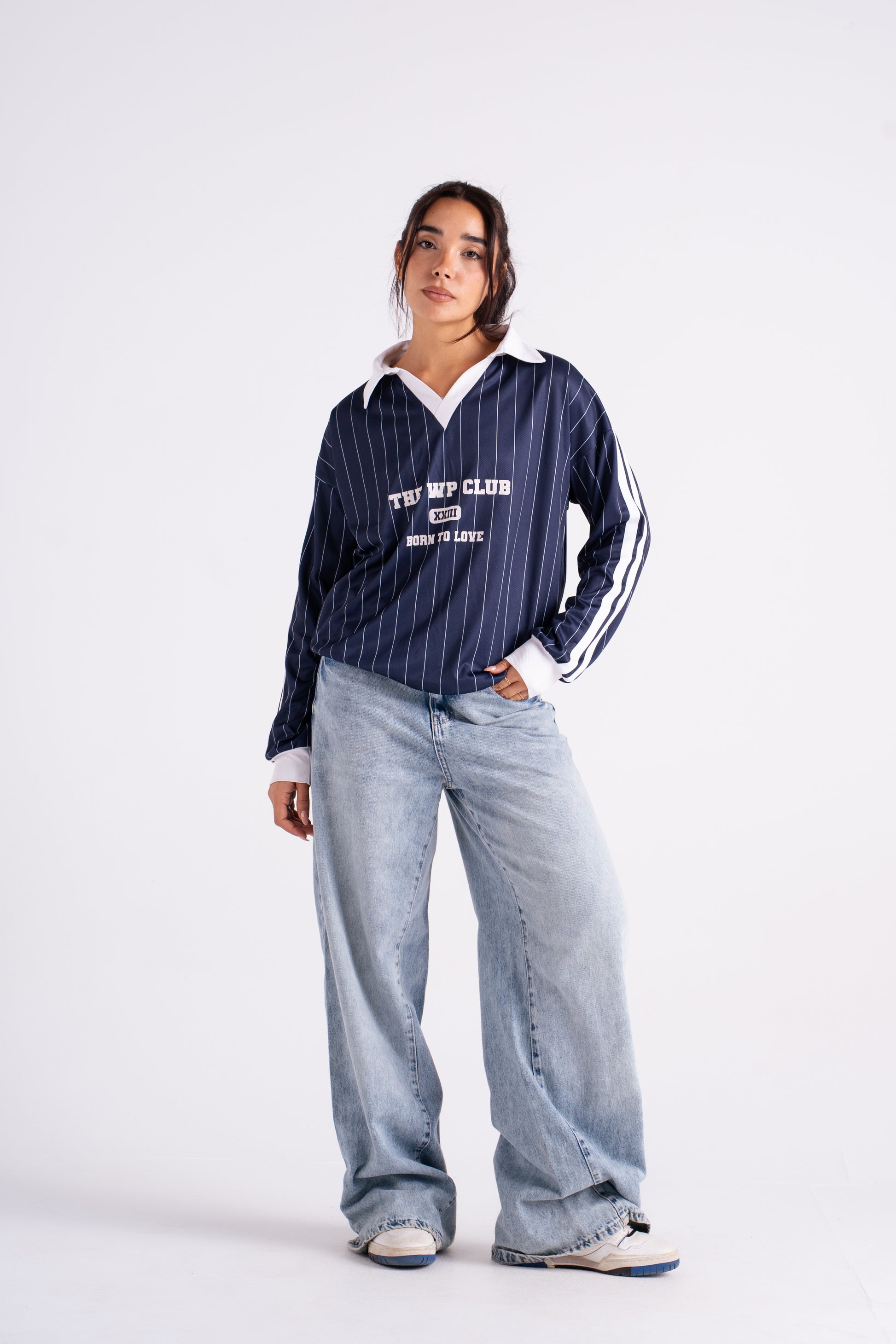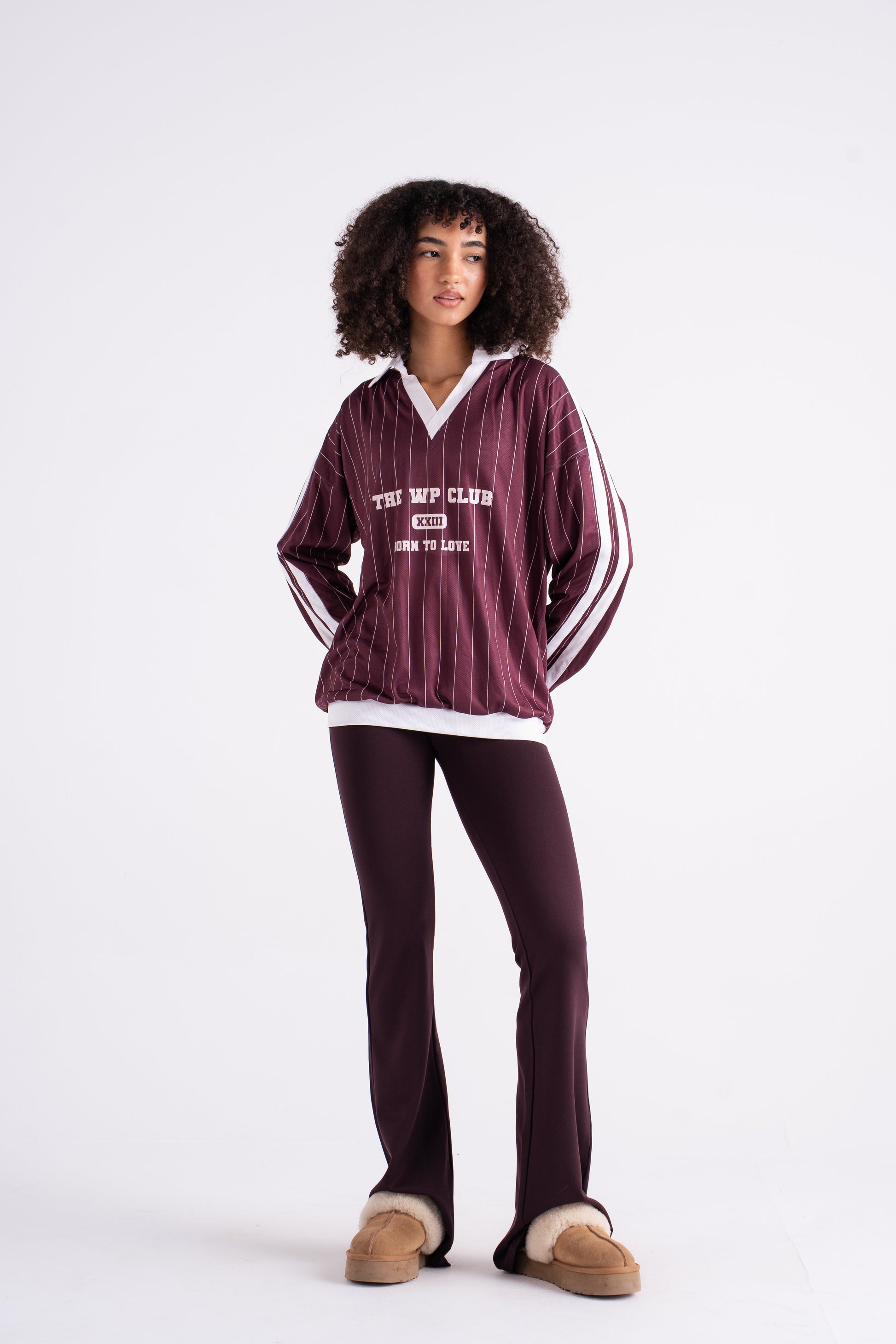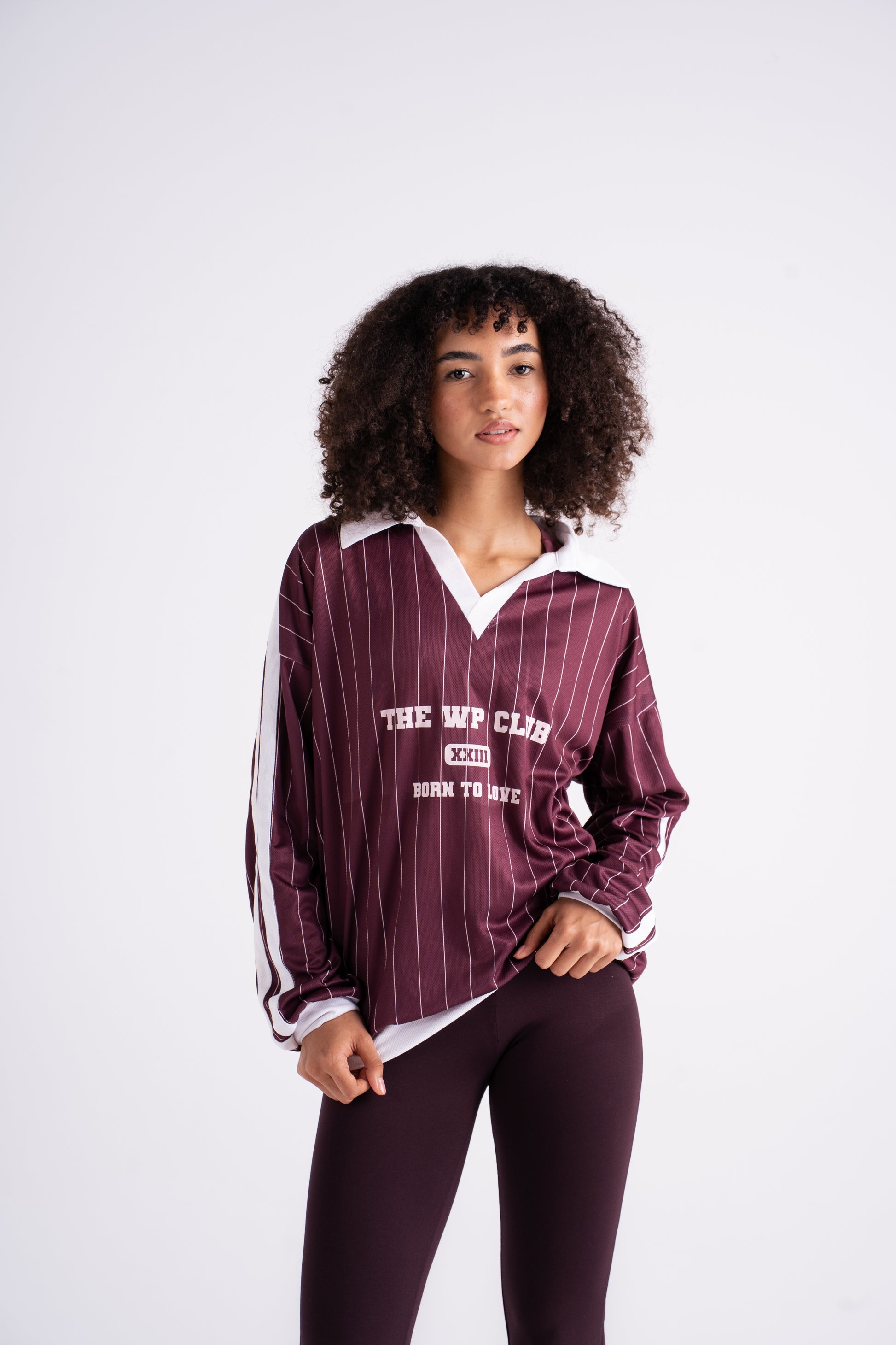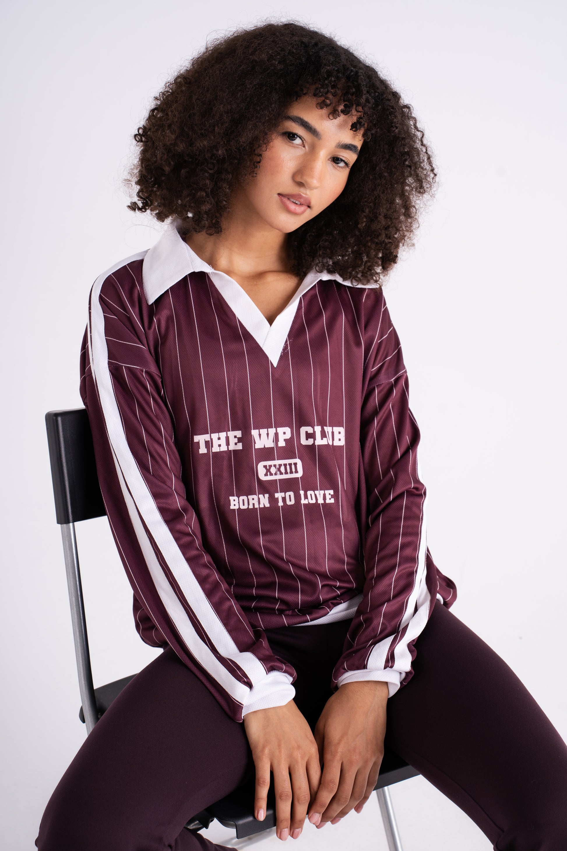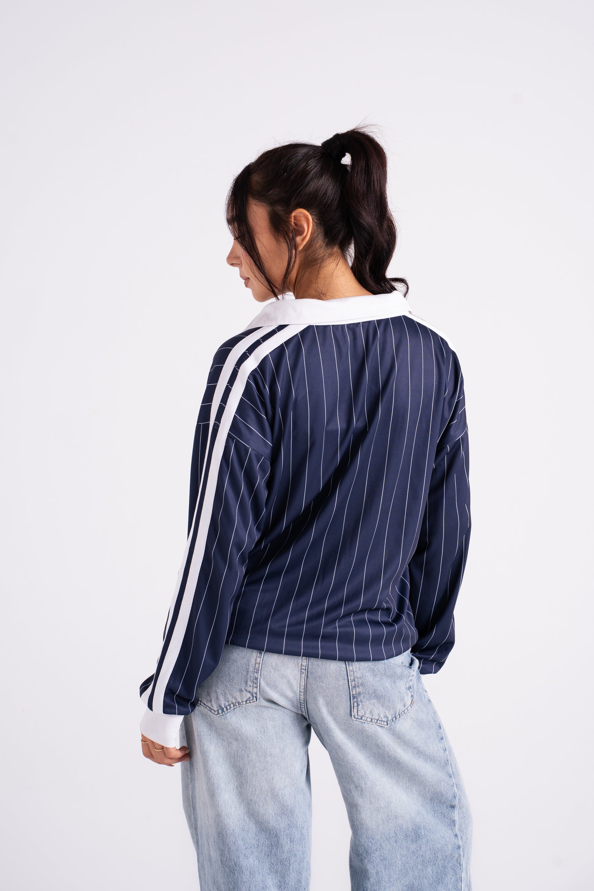 Oversized pinstripe pullover with a contrast v-neck collar and bold front lettering. Crafted from soft, structured cotton blend fabric for that vintage varsity feel. Designed with drop shoulders and wide sleeves for a relaxed silhouette that pairs perfectly with biker shorts, joggers, or over a bra top.