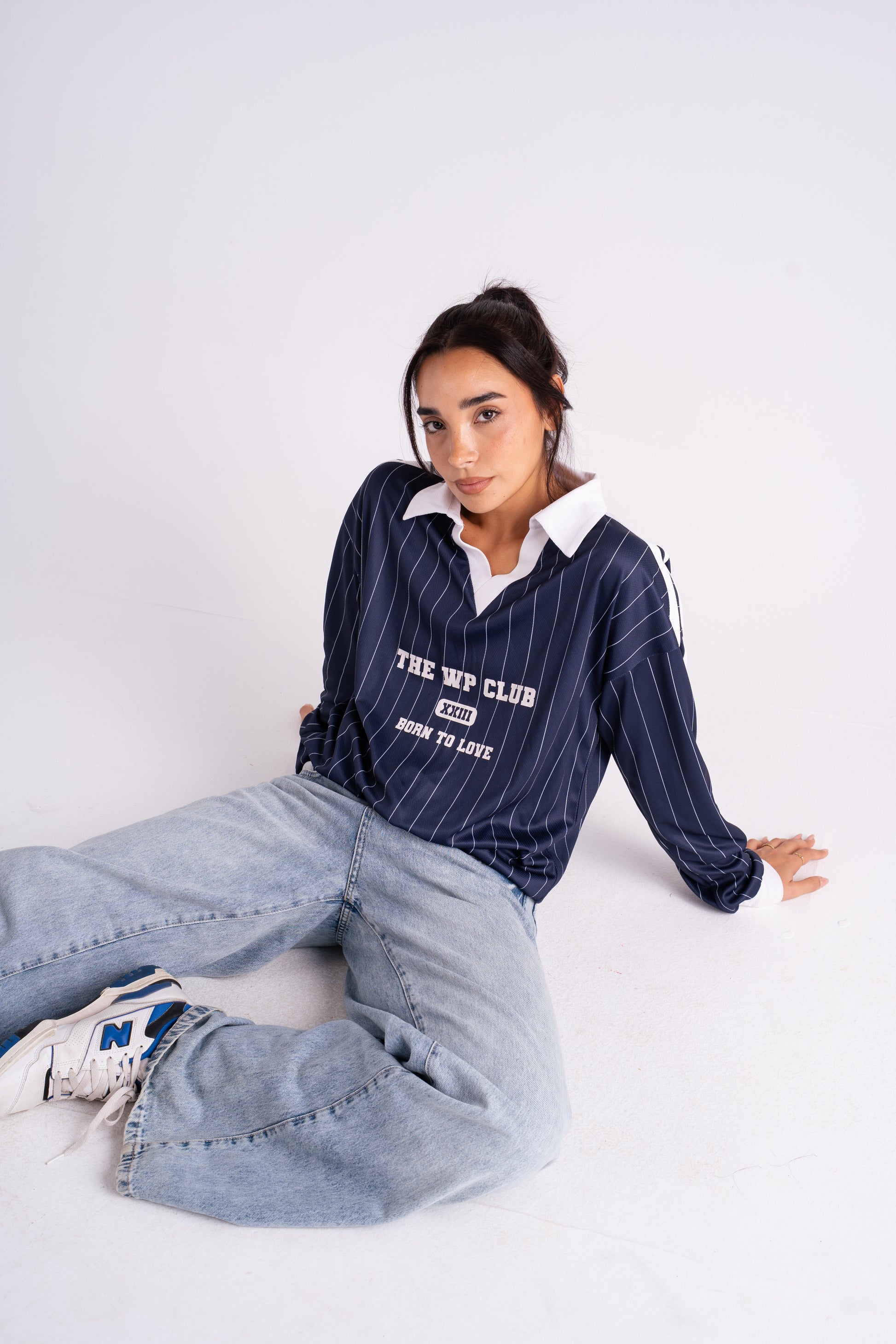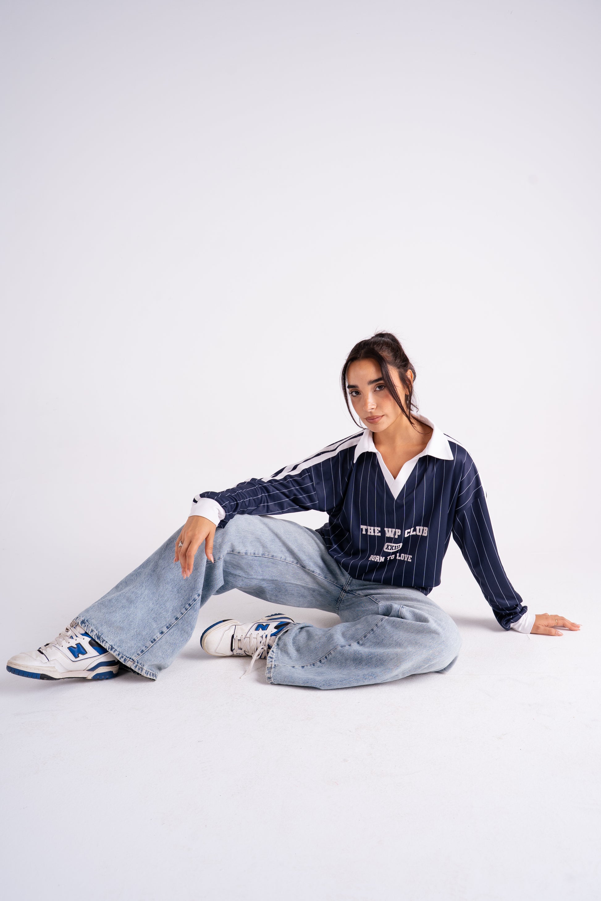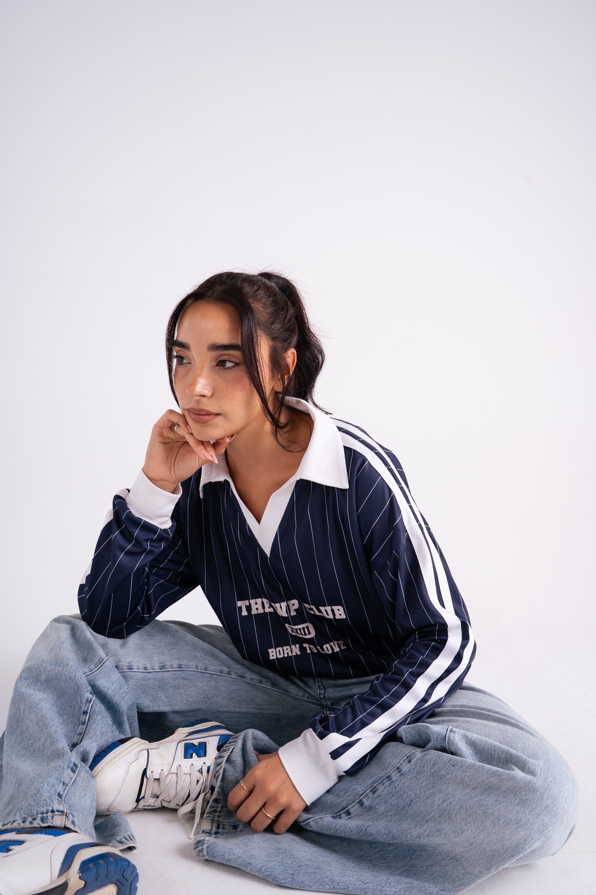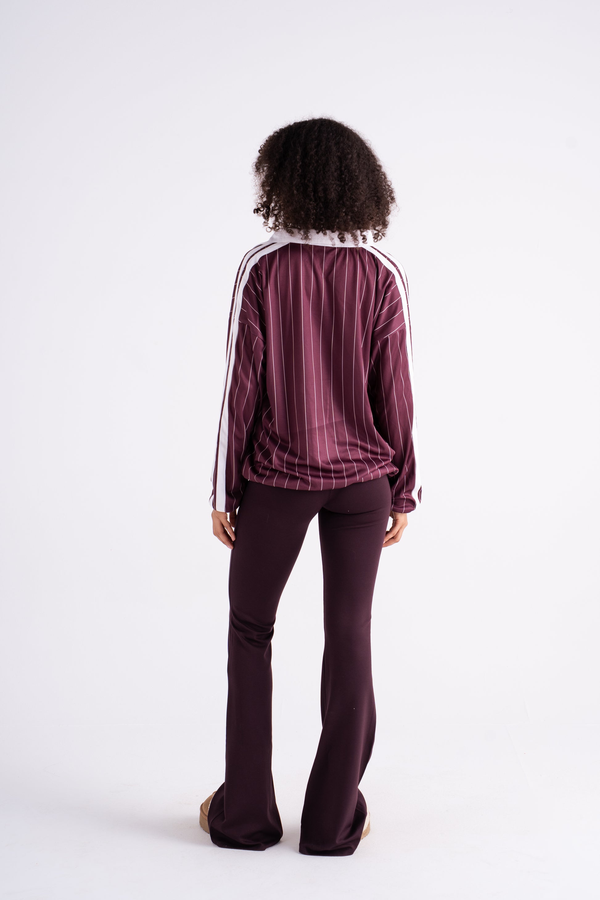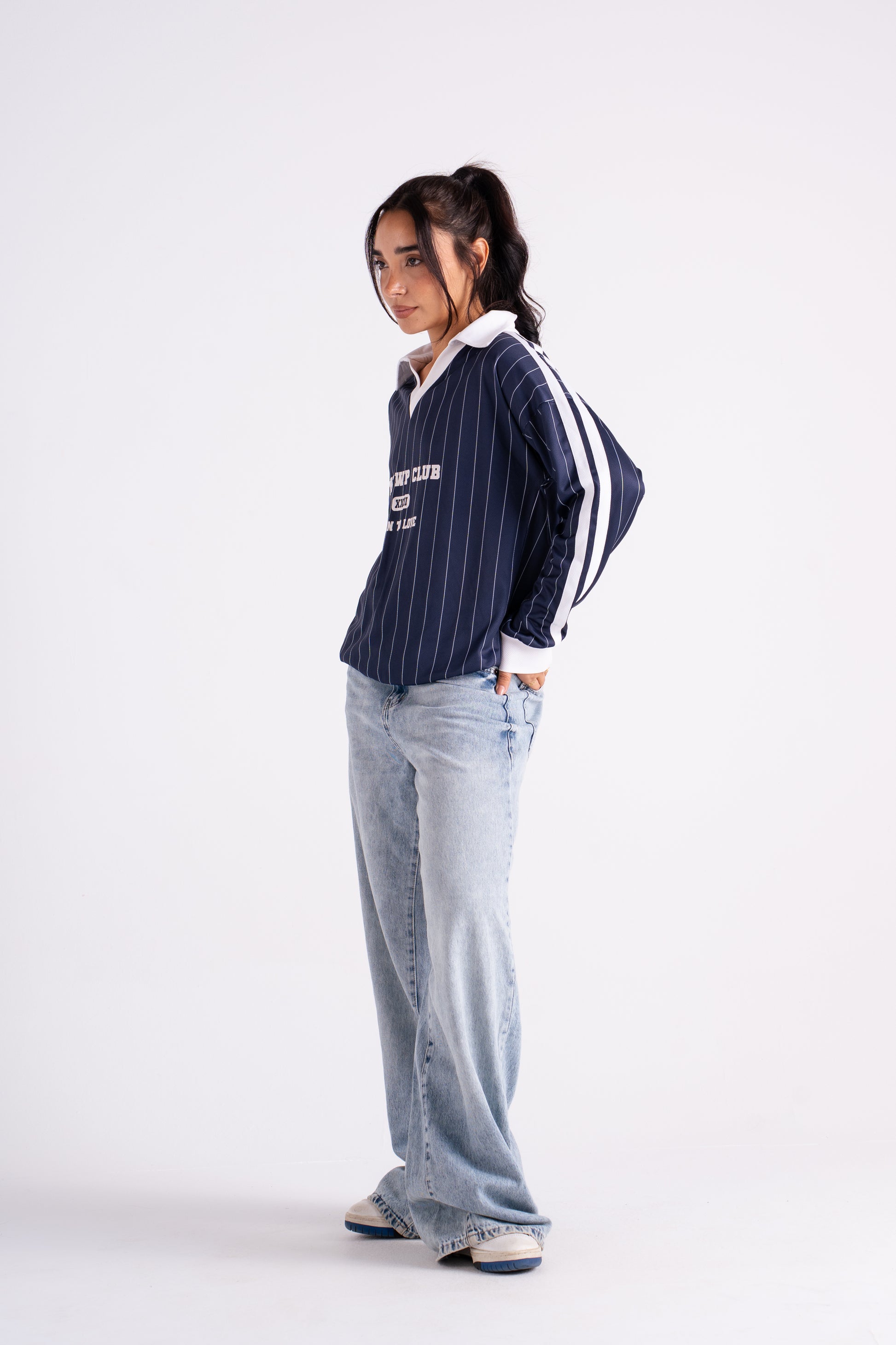 Oversized pinstripe pullover with a contrast v-neck collar and bold front lettering. Crafted from soft, structured cotton blend fabric for that vintage varsity feel. Designed with drop shoulders and wide sleeves for a relaxed silhouette that pairs perfectly with biker shorts, joggers, or over a bra top.