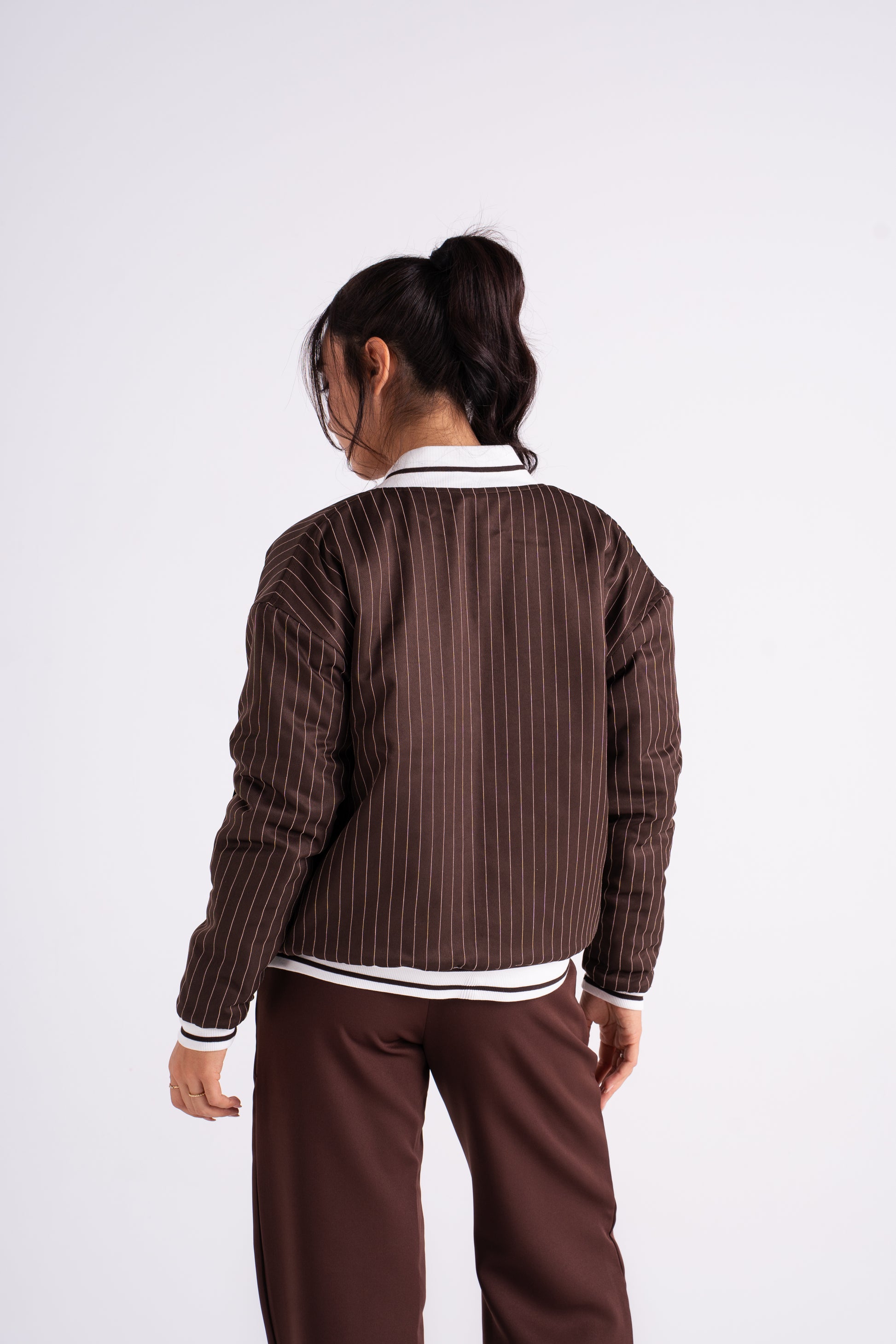 A varsity-inspired bomber jacket reimagined in rich burgundy with fine cream pinstripes. Features a relaxed, slightly boxy fit with ribbed cuffs and collar in contrasting cream for a classic finish. The zip closure and subtle volume make it the perfect throw-on piece — from gym days to city nights.