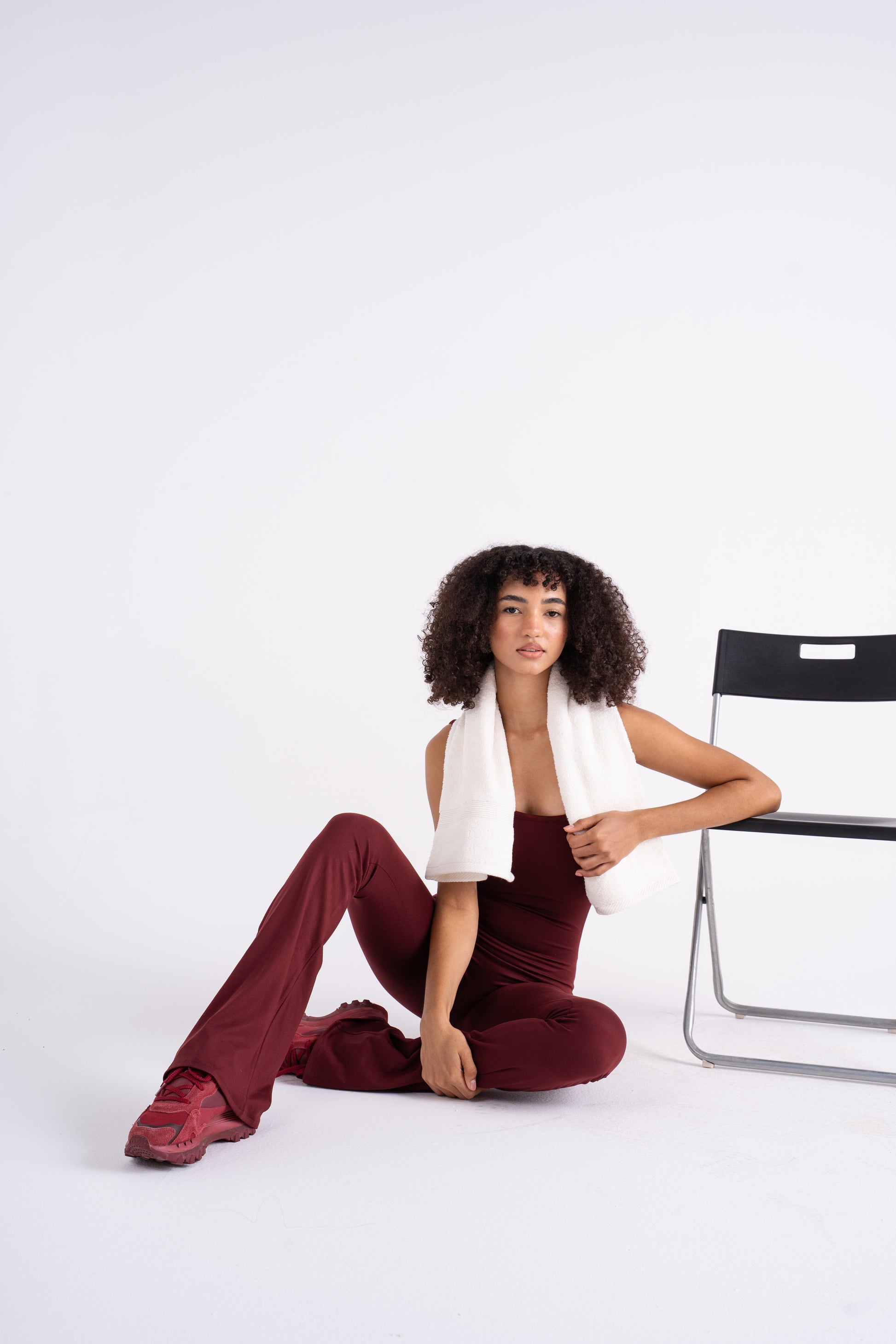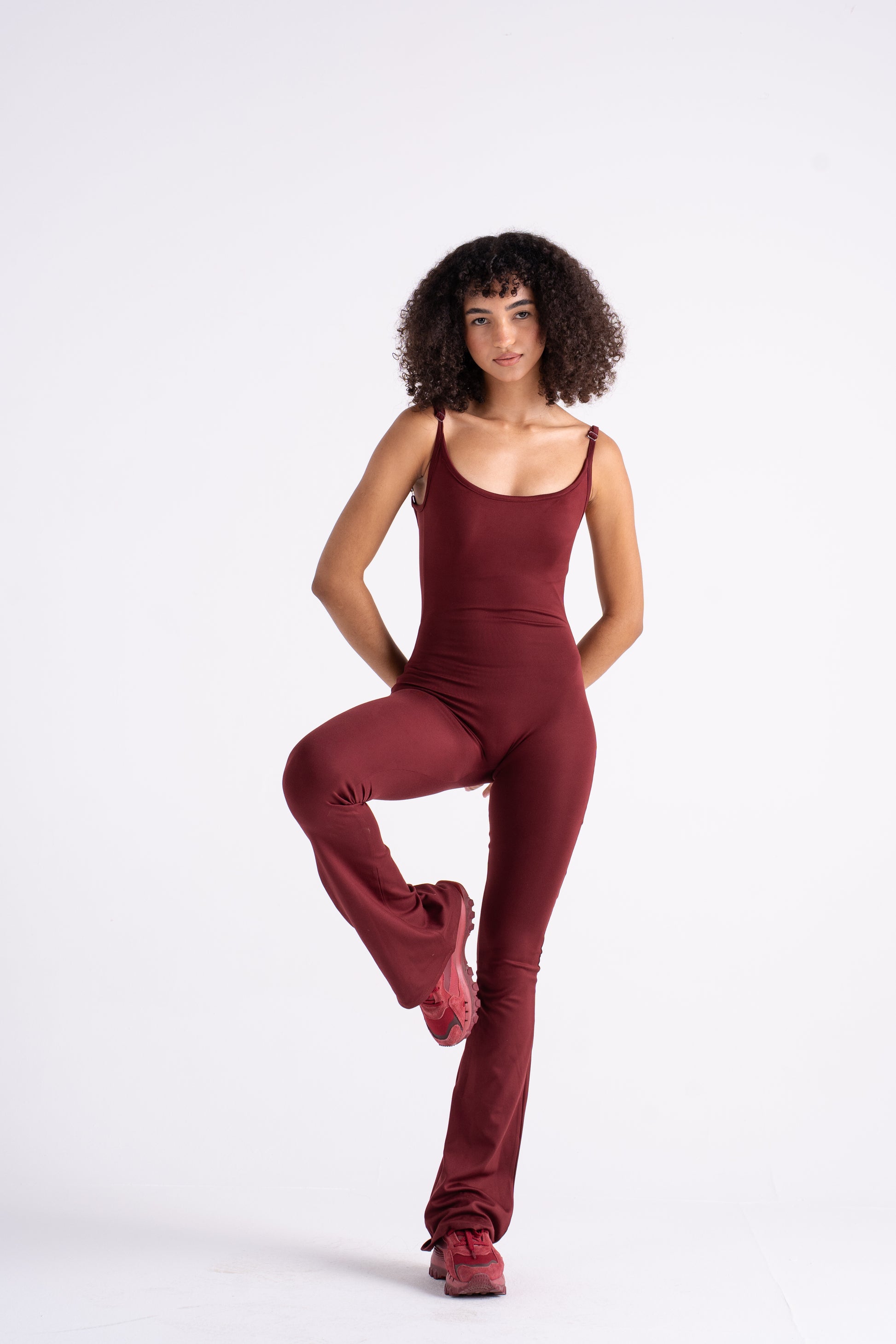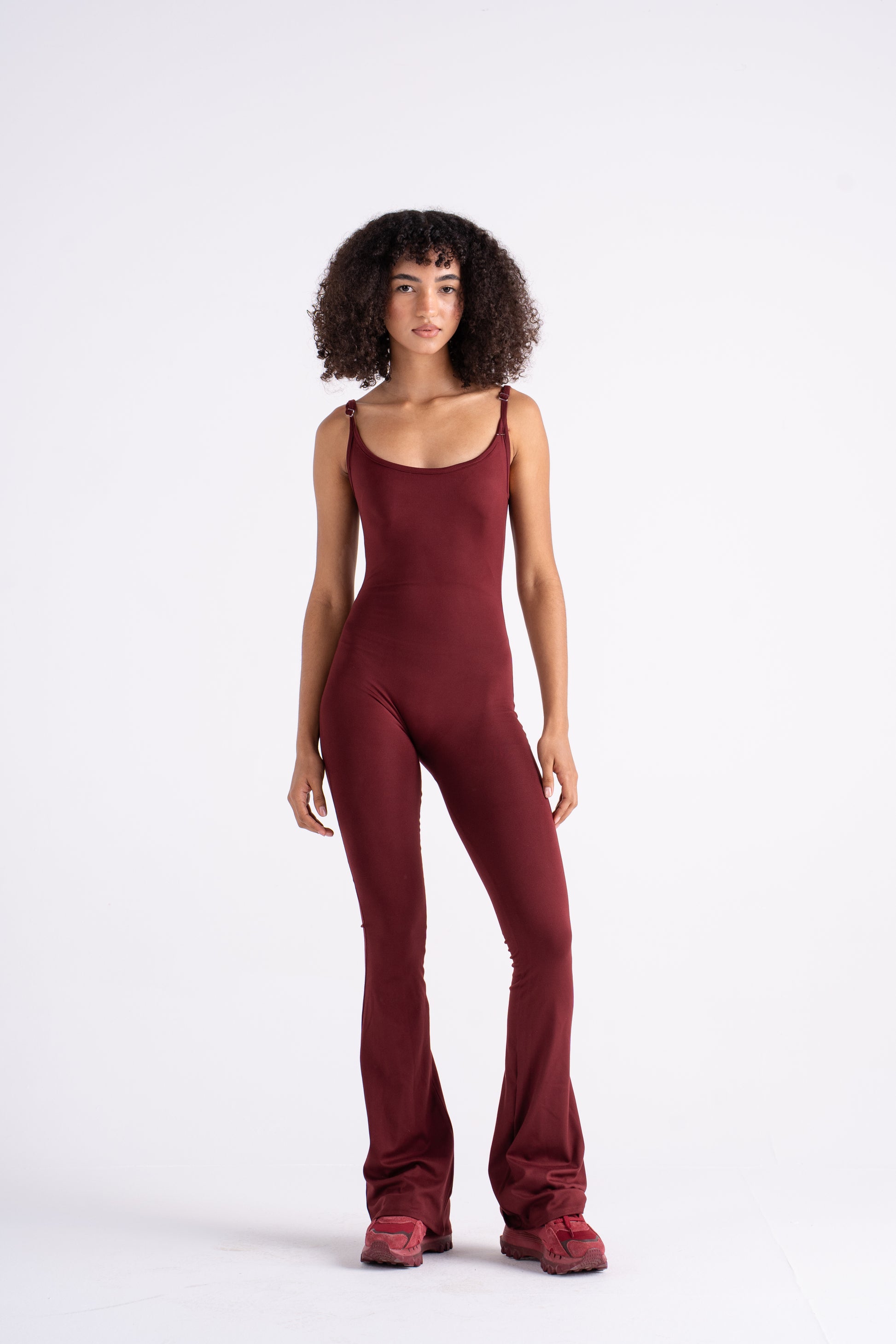 A full-length, form-fitting jumpsuit made from buttery-soft stretch fabric that molds to your shape. Designed with thin adjustable straps, a scoop neckline, and flared legs for a flattering, elongated look. The minimal design and subtle front logo keep it sleek and elevated — perfect for layering under jackets or wearing solo for a bold, confident statement.